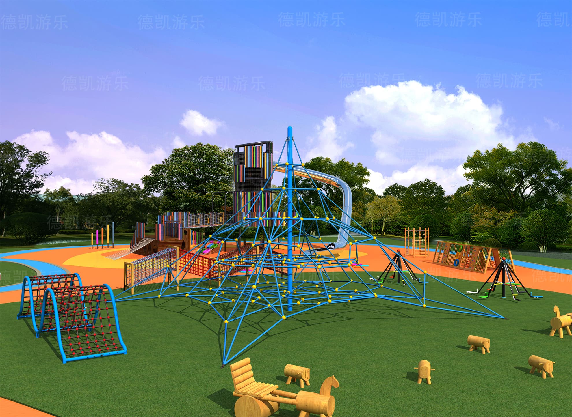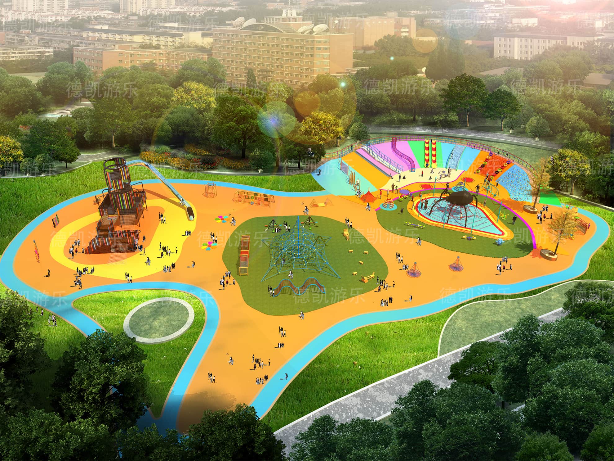 在總體效果圖中,我們大致可以看見這個(gè)游樂園的主要游樂設(shè)備:主體七彩滑梯、勇攀高峰、鉆網(wǎng)、拓展組合、地形游樂、蜘蛛游樂,且每個(gè)設(shè)備都有各自的區(qū)域范圍,構(gòu)成了這個(gè)完整的游樂園。游樂園也周圍環(huán)境相融合,融入到這座城市當(dāng)中,完善著城市的基礎(chǔ)功能。
