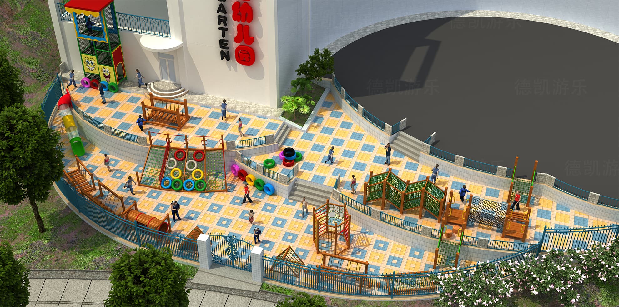 在俯視效果圖里面,我們可以看出整個(gè)園子的東西,木質(zhì)拓展、爬網(wǎng)、滑桶、蕩橋等,一個(gè)個(gè)雅致的游樂(lè)設(shè)備點(diǎn)綴著單調(diào)的幼兒園。而且設(shè)備大部分的材料大部分都是木材,對(duì)于抵抗力弱的孩子們來(lái)說(shuō),健康、環(huán)保才不會(huì)對(duì)他們的身體健康造成負(fù)擔(dān)。就整體而言,設(shè)備比較簡(jiǎn)單,挑戰(zhàn)難度不高,冒險(xiǎn)性很低,很符合這個(gè)幼兒園的主要玩耍人群。