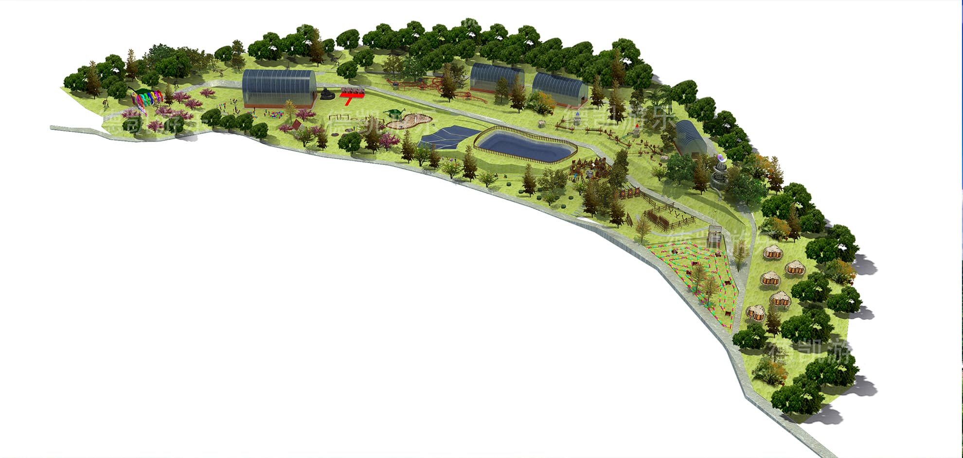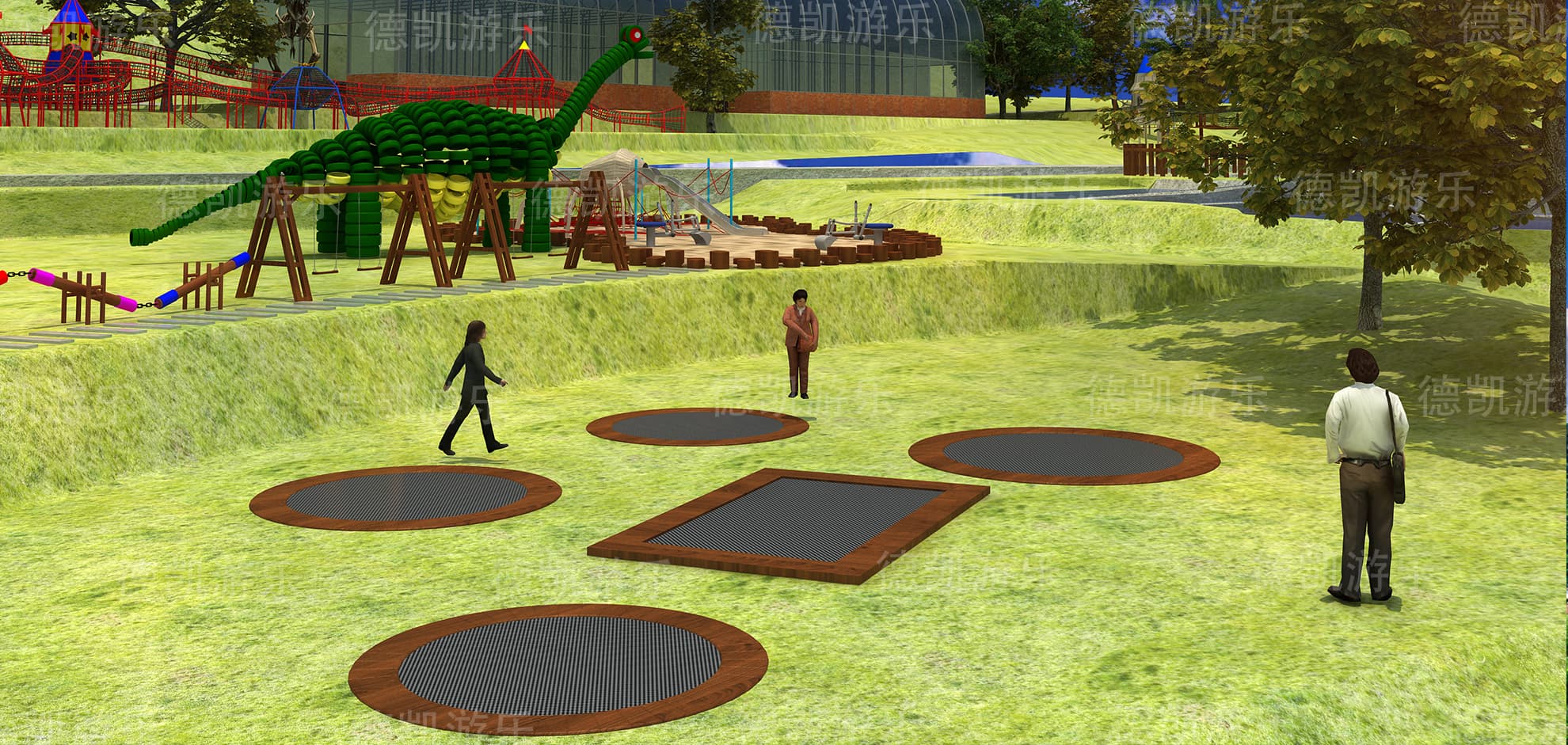 在總體效果圖里面,出來(lái)蔥蔥郁郁的植被,最顯眼的就是兒童游樂設(shè)備了。叢林里面散步的恐龍、幾個(gè)玻璃空間、拓展組合、鉆網(wǎng)滑梯、城堡滑梯、叢林滑梯、小迷宮等。因?yàn)閰擦种脖惠^密,所以能夠空間的游樂設(shè)備有限,而且效果圖整體較小,只能看見比較集中或者大型的游樂設(shè)備。